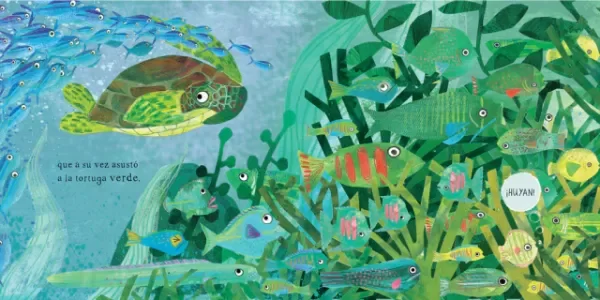 Las vibrantes y coloridas estampas destacan por su extraordinaria plasticidad y la riqueza de matices del universo de criaturas acuáticas. La ilustradora combina pintura y collage, utilizando dibujos recortados, que aportan textura y movimiento a las composiciones.