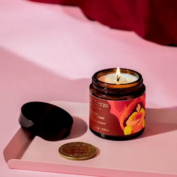Vela petite de tarot La Fuerza, de tonka & cedro, fragancia intensa y especiada.
