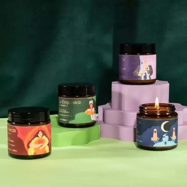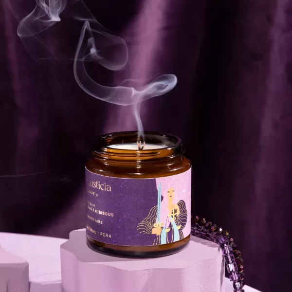 Vela petite de tarot La Justicia, de peonías e hibiscus, fragancia suave y floral.