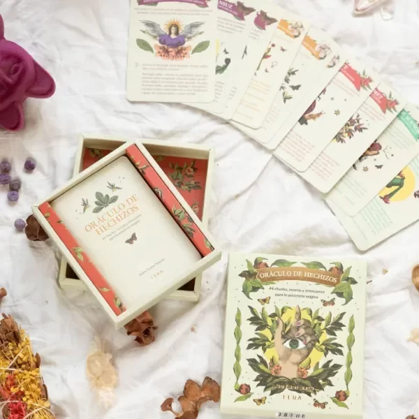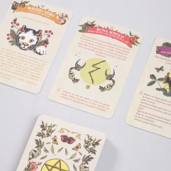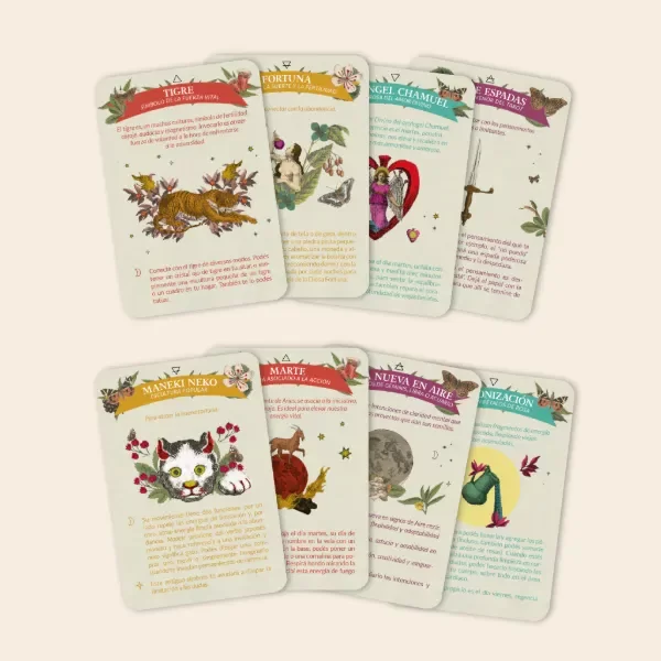 Este oráculo contiene 44 cartas que se dividen en los 4 elementos: Fuego, Tierra, Aire y Agua.